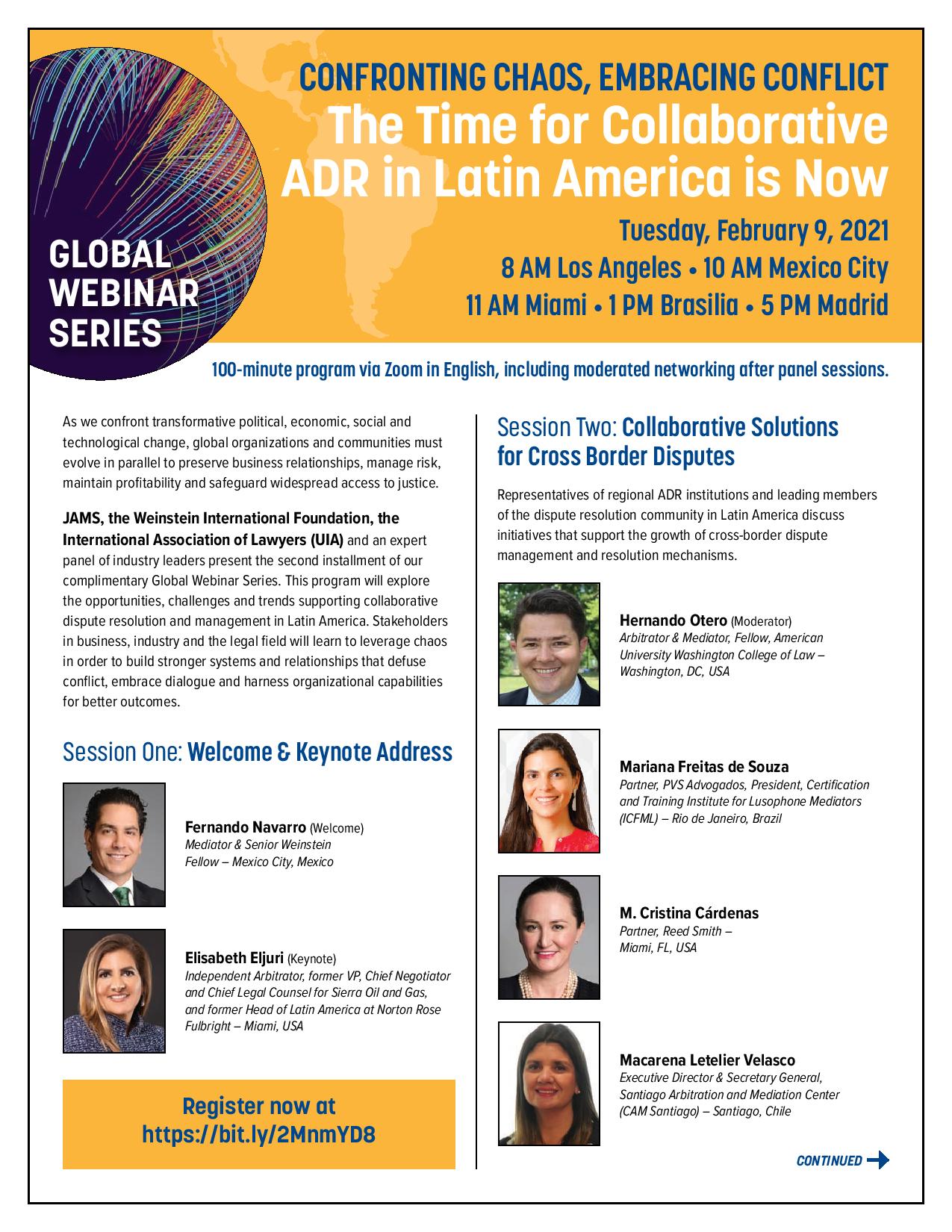 El martes 9 de febrero a las 13:00 (hora de Chile continental) la directora ejecutiva del CAM Santiago, Macarena Letelier ,participará en la segunda sesión del Ciclo «Confronting Chaos, Embracing Conflict: The Time for Collaborative ADR in Latin America is Now», organizado por JAMS, Weinstein International Foundation y Union Internationale des Avocats.
