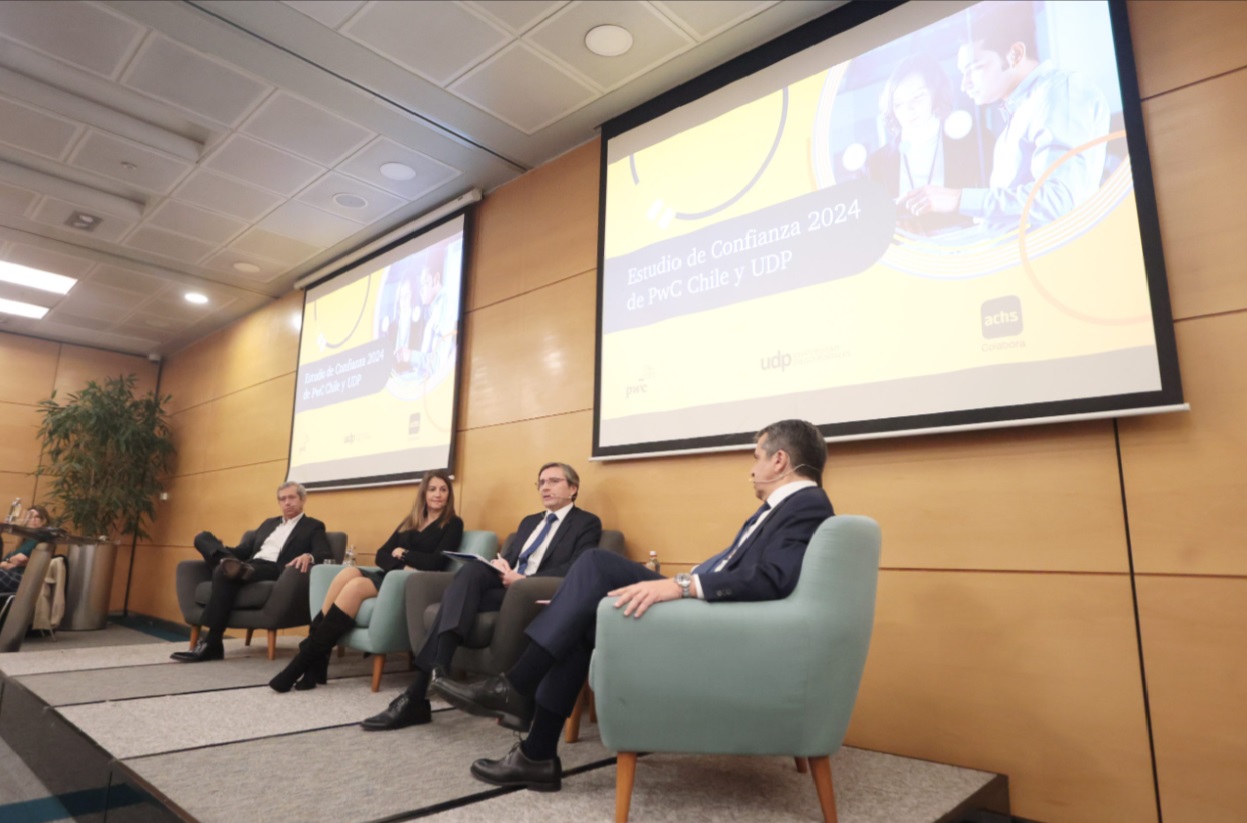 22 de mayo de 2024. El pasado martes 14 de mayo María Soledad Lagos Ochoa, Jefa de la Unidad de Mediación, junto a las abogadas Mariana Fernández Galaz y Paulina Pino Burgués (case managers), asistieron como público al desayuno en que se presentaron los resultados del Estudio de Confianza 2024 elaborado por PwC Chile, en conjunto con la Universidad Diego Portales (UDP) y con la colaboración de la Asociación Chilena de Seguridad (Achs).